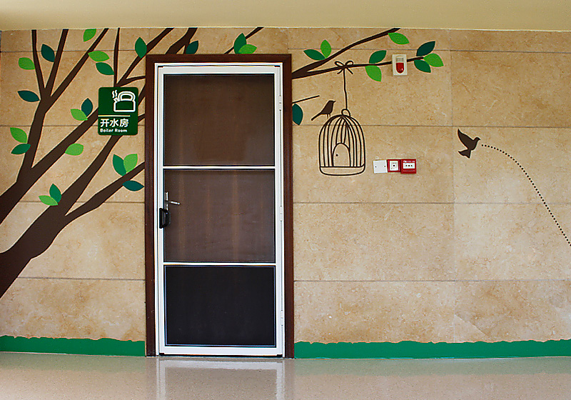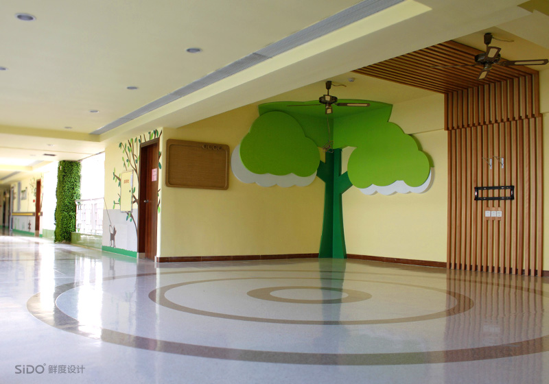 在節約施工成本的基礎上,鮮度制定出【充滿生機的愉悅生活景象】的設計主題。以溫暖黃色系作為空間主色調,并輔加充滿生機的綠色系,通過繪制趣味朝氣的生活場景圖形來豐盈整個空間氛圍,結合立體樹、仿真植物、木紋用品家具等表現形式來協調空間美感,驅散冰冷,呈現一派生機盎然、老有所依的愉悅生活景象,以此強化松鶴品牌溫馨快樂養老的形象,給長者增加一份心里的舒適。